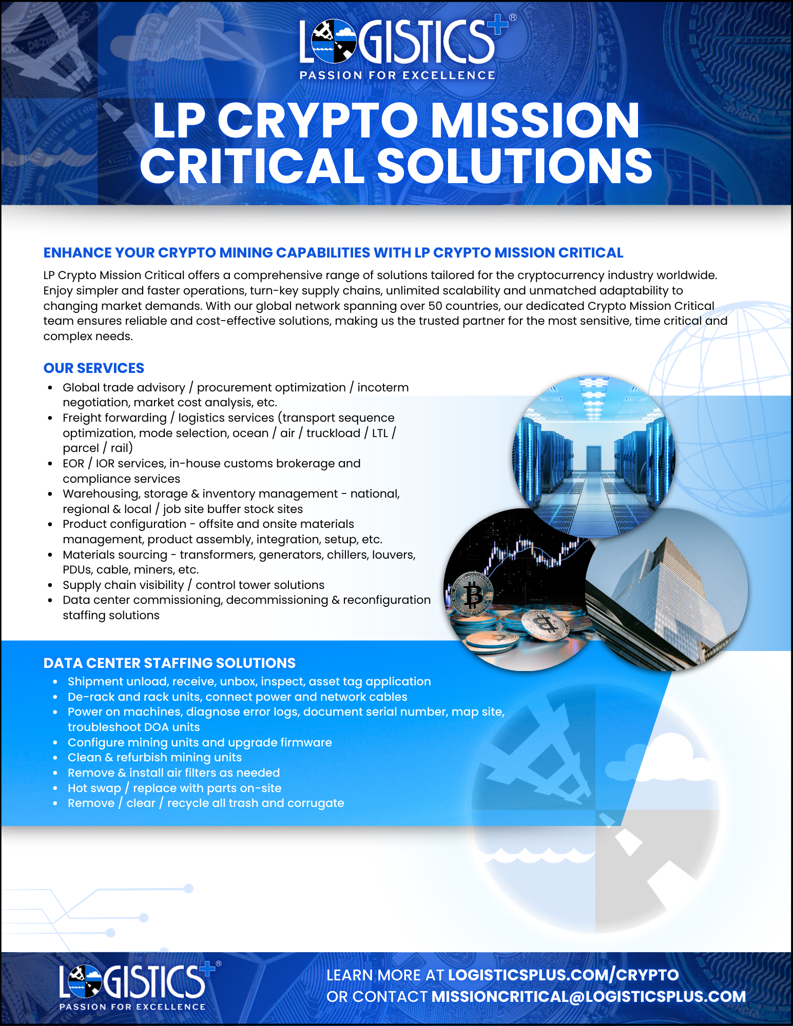 LP Crypto Mission Critical offers a comprehensive range of solutions tailored for the cryptocurrency industry worldwide. Enjoy simpler and faster operations, turn-key supply chains, unlimited scalability and unmatched adaptability to changing market demands. With our global network spanning over 50 countries, our dedicated Crypto Mission Critical team ensures reliable and cost-effective solutions, making us the trusted partner for the most sensitive, time critical and complex needs.